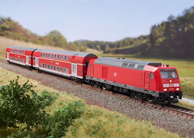 Modell: Fahrgestell der Lokomotive aus Metalldruckguss. mfx-/DCC-Decoder mit Geräuschgenerator. 5-poliger Motor mit Schwungmasse. Mit Kinematik für Kurzkupplung. Spitzensignal mit der Fahrtrichtung wechselnd, 4 Achsen angetrieben, Haftreifen. Wagen mit Kinematik für Kurzkupplung. Mit Mobile Station, Gleisanschluss-Box, Schaltnetzteil 230 V/30 VA, Gleisoval mit gebogenen Gleisen im Radius 2. Benötigte Grundfläche: 90 x 47 cm. Gesamtlänge über Puffer des Zuges ca. 452 mm. Vorbild: Eine dieselelektrische Streckenlokomotive angelehnt an die Baureihe 245, ein Doppelstockwagen der 1./2. Klasse und ein Doppelstockwagen der 2. Klasse der Deutschen Bahn AG (DB AG). Betriebszustand um 2013.
